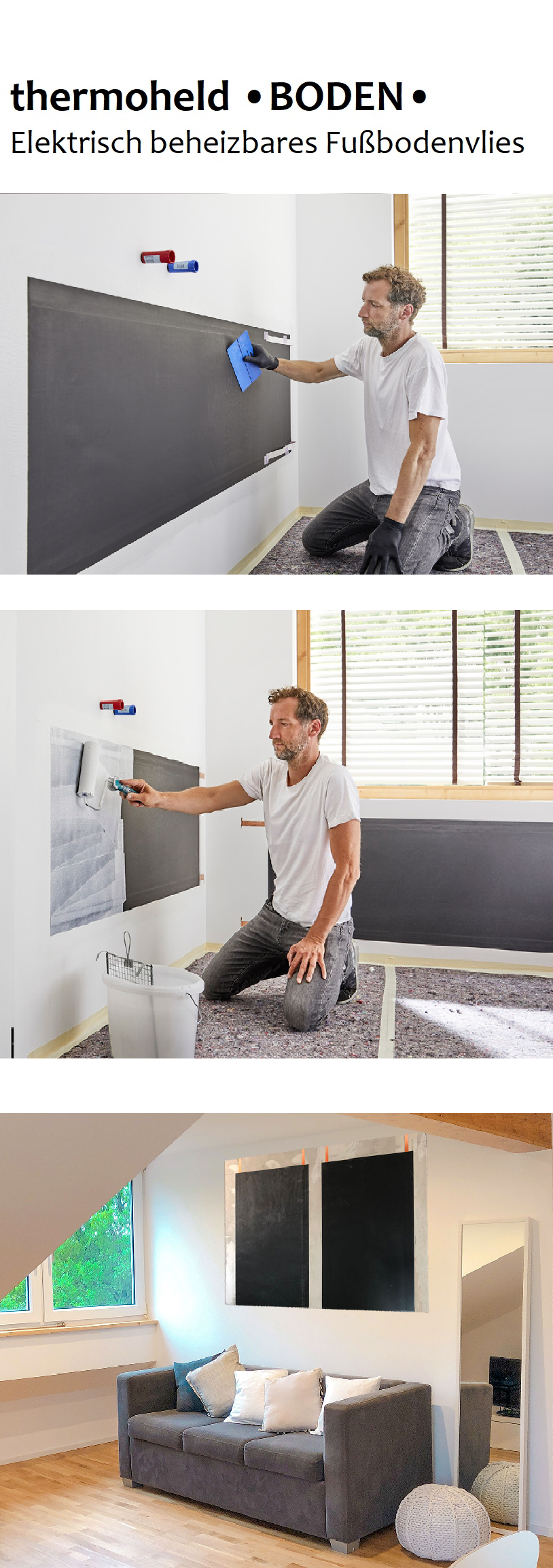 thermoheld •BODEN• ist eine moderne ultradünne Fußbodenheizung. Mit einer Aufbauhöhe von 0,5 Millimetern macht sich der elektrisch beheizbare Vliesaufbau so schlank, dass sie direkt unter dem Fußbodenbelag verlegt werden kann. Denn thermoheld •BODEN• funktioniert im Gegensatz zu anderen Infrarotsystemen am Markt mit sicherer Niedervolttechnik (24 V). Die behagliche Strahlungswärme wärmt innerhalb kürzester Zeit nicht nur die Füße, sondern den gesamten Raum.