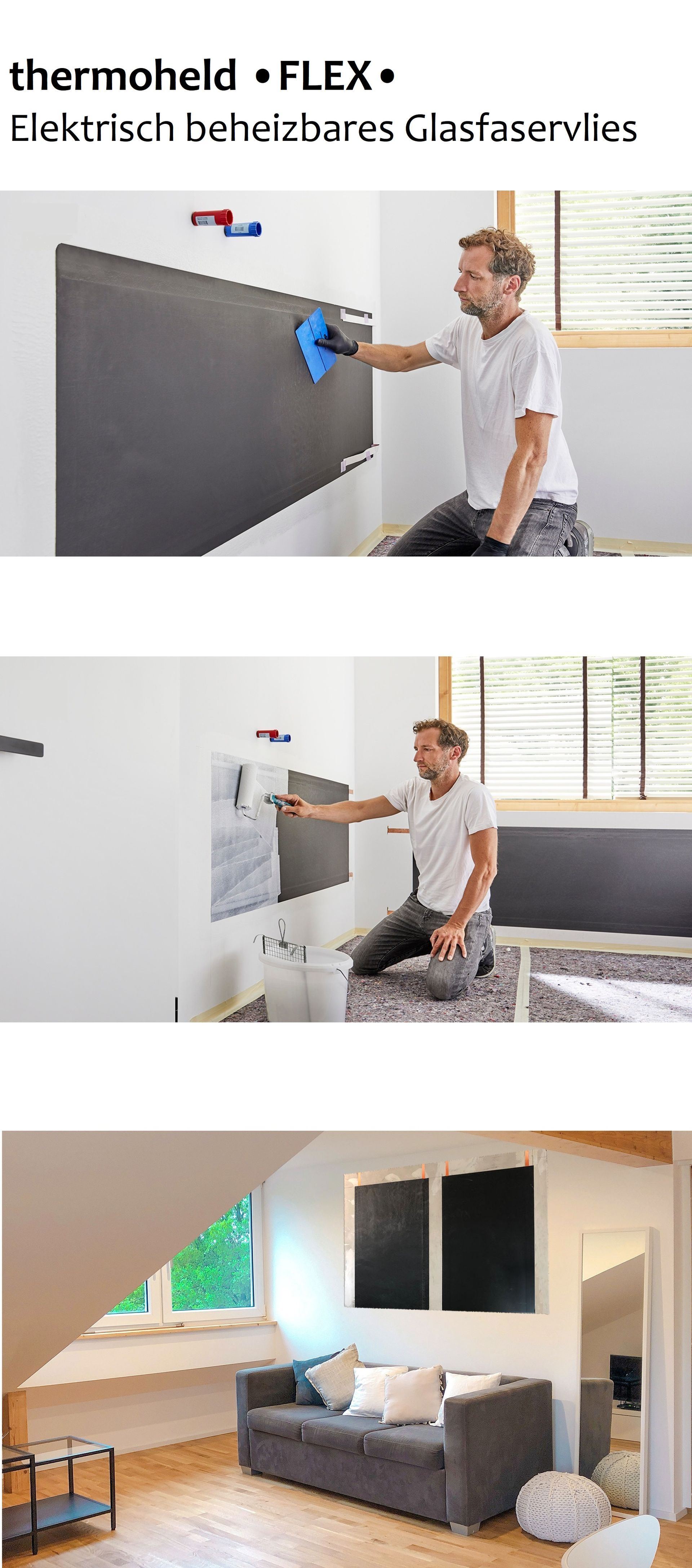 Elektrisch beheizbare thermoheld-Produkte schaffen Wärmequellen genau dort, wo sie benötigt werden. Das eröffnet Bauherren und Modernisierern ganz neue Möglichkeiten in der Wohnraumgestaltung. Angefangen bei dem schnell zu verarbeitende Glasfaservlies thermoheld •FLEX• bis hin zur ultradünnen Fußbodenheizung thermoheld •BODEN•. Sollen große Flächen mit Infrarotwärme beheizt werden, ist thermoheld •WAND• das Heizsystem der Wahl. Das Glasfasergitter thermoheld •FLIESE• kann Oberflächen wahlweise temperieren oder beheizen.
