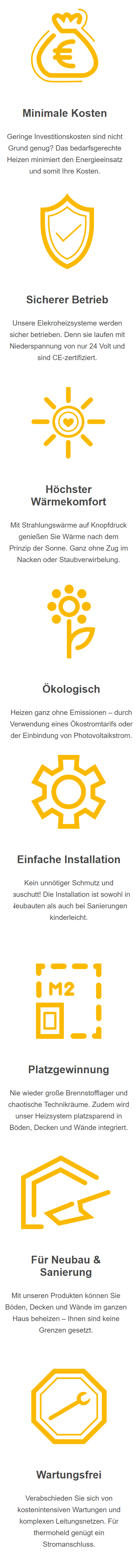 behagliche Strahlungswärme niedrige Aufbauhöhe von 0,5 mm leicht zu verarbeitende Vliesbahn schnelle Reaktionszeit – bedarfsgerechte Steuerung über programmierbares Thermostat ideal als Fußbodenheizung hochleitfähig durch innovative Kohlenstoff-Technologie sicherer Betrieb mit Niedervoltspannung (24 V)